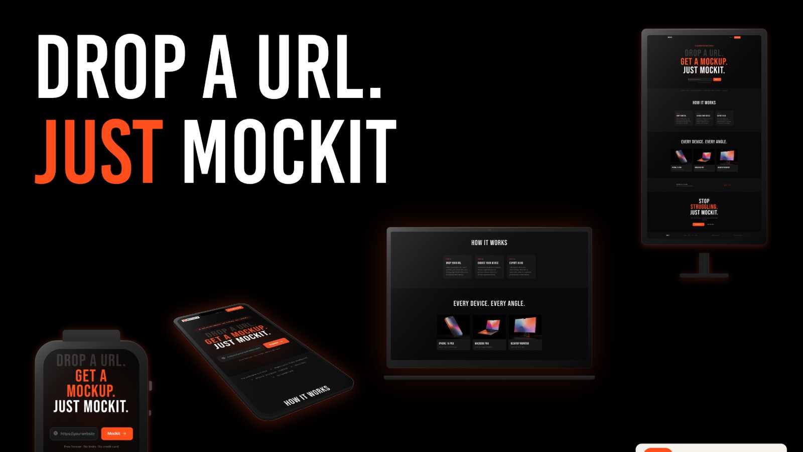 Professional device mockups used to mean Photoshop smart objects, paid Figma plugins, or cloud tools that made you wait in a render queue for a flat PNG. Founders, indie hackers, and freelancers kept shipping decks and landing pages with generic, lifeless screenshots — not because they lacked taste, but because the tools were too slow, too expensive, or too complicated. Mockit was built to fix that. One URL. One click. One export.